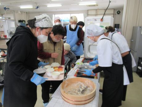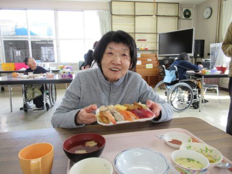 先日、寿司バイキングが行われました。固定メニューの他にまぐろ、サーモン、あぶりしめさば、むしえび、あなごの中から好きな物を5貫選んでいただきました。「美味しい」との声が聞かれ中にはお替りする利用者もいて大好評でした。